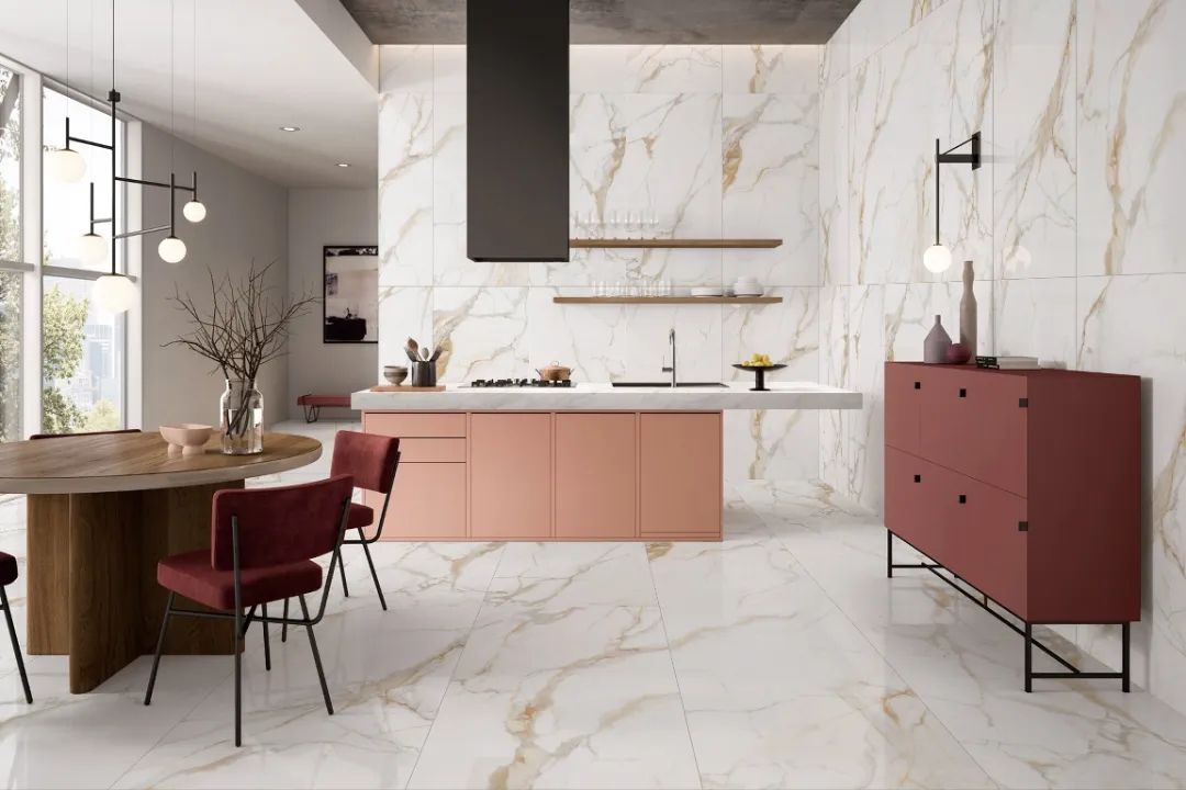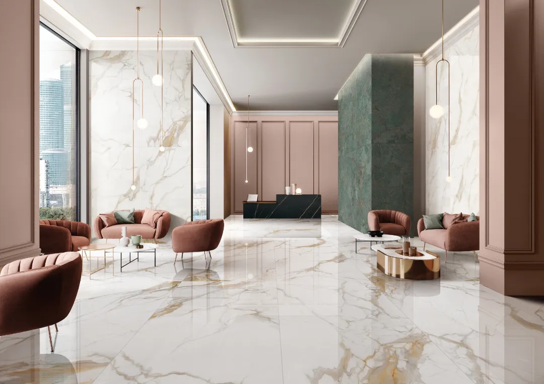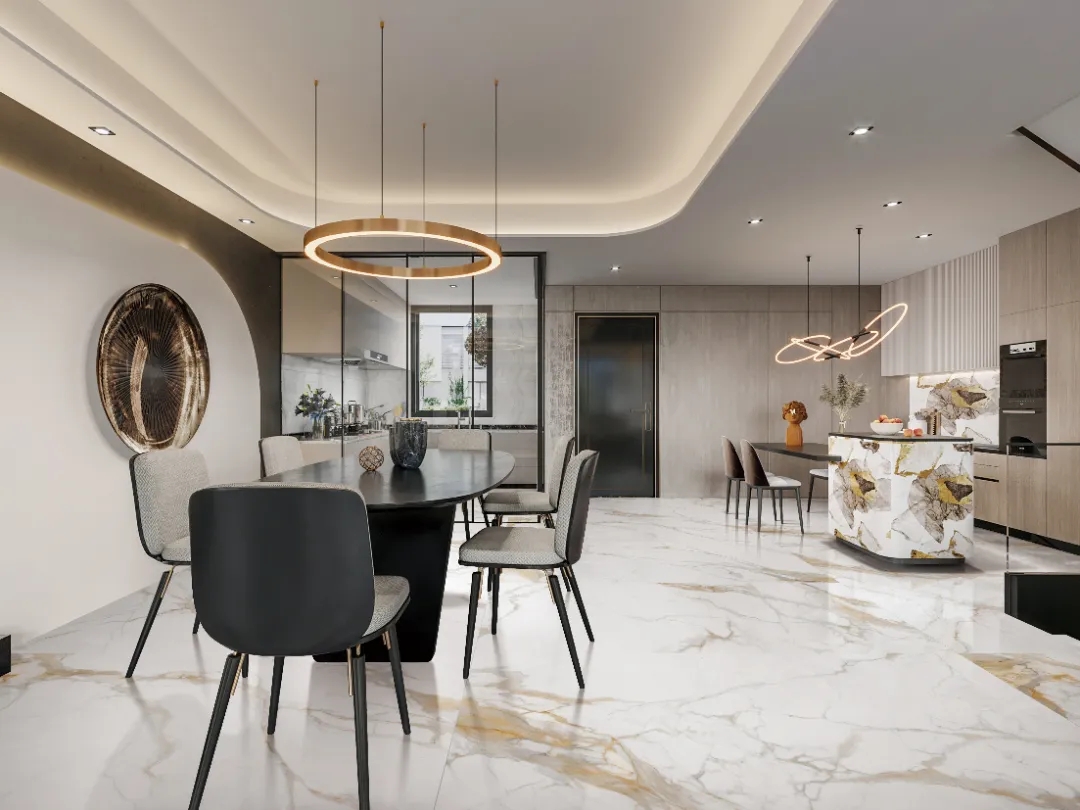 羅曼締克瓷磚【魚肚金】規格為600x1200mm/900x1800mm,家裝可用在客廳、餐廳、浴室等區域,亦可應用在酒店大堂、高檔會所等商業空間中。