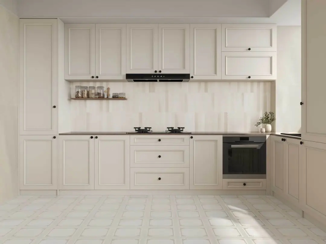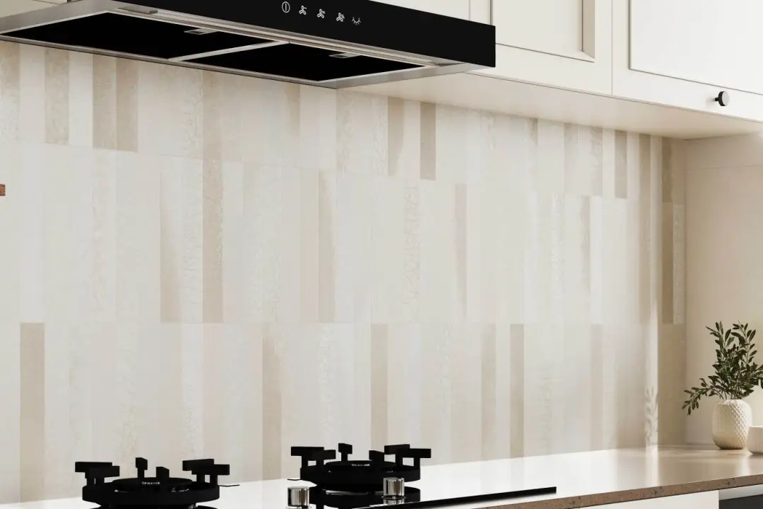 米白淺調(diào)為底,利落的豎條紋將裂紋解構(gòu)為現(xiàn)代幾何語(yǔ)言。鋪陳于廚房墻面,豎紋延展了視覺(jué)縱深,簡(jiǎn)潔的肌理在光影中形成微妙層次。空間仿佛被施以留白的魔法,浮躁悄然沉淀,只余下空靈悠遠(yuǎn)的靜謐與優(yōu)雅。